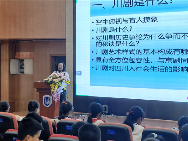 四川艺术职业学院科研处研究员张志刚给小记者们分享川剧,模拟川剧课程新闻发布会