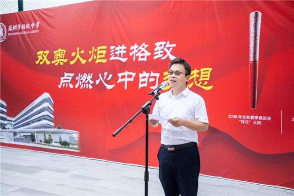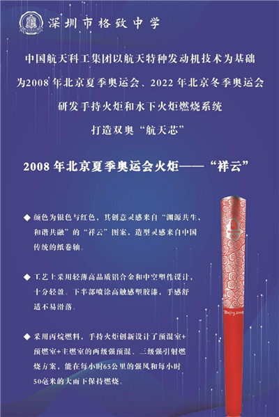 6月2日上午,广东省深圳市格致中学隆重举行2008 年北京夏季奥运会火炬“祥云”和2022年北京冬季奥运会火炬“飞扬”入校仪式。2008年北京奥运会羽毛球女双冠军于洋,深圳航天科创实业有限公司党总支书记、董事长王凯让以及学生家长代表出席仪式。