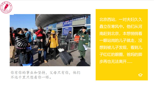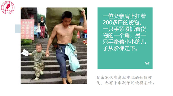 中国网小记者课程部雷老师以图文并茂的方式拉开了本节课的序幕。她用“父亲”的照片引入,让小记者们在心里默数5秒钟,感受自己的内心。画面中,一位父亲扛着200斤重的包裹,另一只手却牵着孩子;另一张照片中,已是瓢泼大雨,父亲却全然不顾自己淋湿,把唯一的伞给了孩子,为他遮风挡雨;还有一张照片中,一对夫妇从河南赶到北京,他们本想悄悄看一眼站岗的儿子就走,没想到被儿子发现了,看到儿子红红的眼圈,父亲的脚步再也停不下来了……这些都体现着“父爱无声,但它一直都在”的精神内涵。