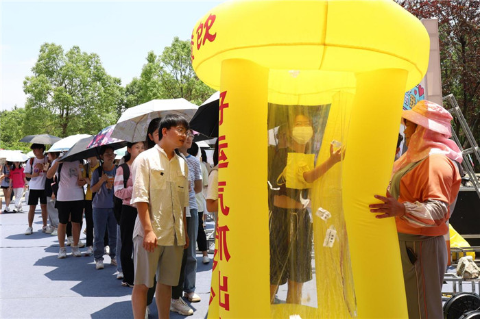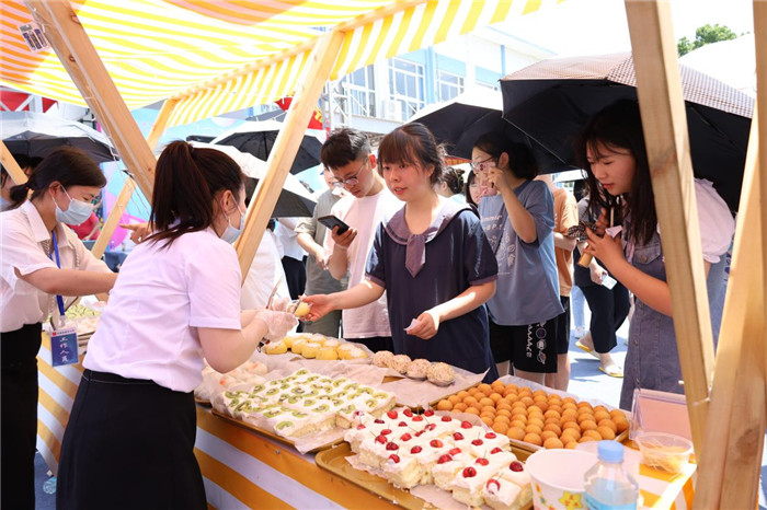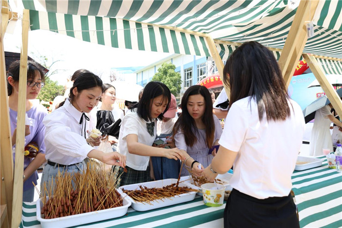 五米长大蛋糕、数十种炸串、各式各样的甜点……美食品尝区的摊位前挤满了学生。学生通过拍照上传美食节图片至QQ、微信、抖音等平台,即可领取一张美食券,凭美食券可在活动现场任意试吃一种美食。