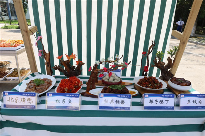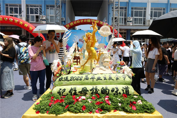 除了糖艺,美食雕刻也给学生们带来了一场视觉盛宴。展翅翱翔的大鹰、威风凛凛的公鸡、昂首挺胸的孔雀等精致的面塑夺人眼球,迎客松、椰子树等冷菜拼盘也毫不逊色。比美现场,冬瓜雕刻拔得头筹,雕刻师通过对瓜皮的打磨,花费十个小时将两个长达两米的冬瓜雕刻出“欢送2022届毕业生美食节 记住母校的味道”的字样。