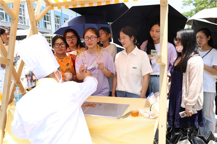 麦芽糖入锅加热,高温融化成糖浆,用勺子舀一瓢,半空勾勒出形状,淋在模板上……糖人制作的熟练手法让四周的学生们赞叹不已。“手法专业,技术一流,简直太厉害了!”蝴蝶、小猫、兔子等形状的糖人满足了学生们的小心愿,让这门美食艺术深深地“烙”在他们心上。