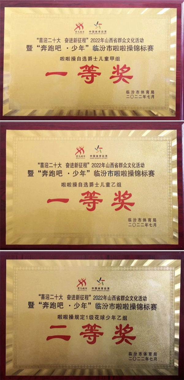 捷报传来,让我们一睹为快,临汾市五一路学校荣获2022年“荀子杯”临汾市学生足球锦标赛小学女子组和初中女子组双冠军;摘得2022年临汾市“东联杯”学生排球锦标赛初中女子组桂冠;在“喜迎二十大 奋进新征程”2022年山西省群众文化活动暨“奔跑吧·少年”临汾市啦啦操锦标赛中,分别获得啦啦操自选爵士儿童甲组一等奖、啦啦操自选爵士儿童乙组一等奖和啦啦操规定1级花球少年乙组二等奖的好成绩。