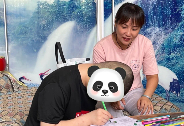 “房子该涂什么色呢?树木该选择哪支彩笔呢?”宋琰坐在鑫鑫身边,语气温和、极具耐心,鑫鑫则神情专注,在画纸上认真涂抹颜色。