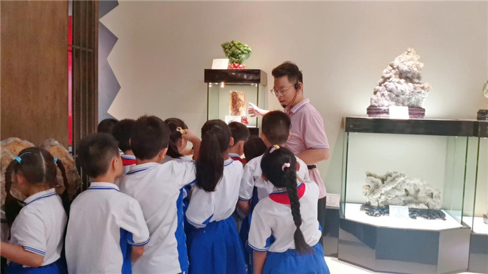 16名小队员在地质科普馆讲解员老师的带领下,走进了新奇的矿物世界。从“地质”到“岩石”再到“矿物”,随着讲解的不断深入,小队员们听得十分专注和入迷。