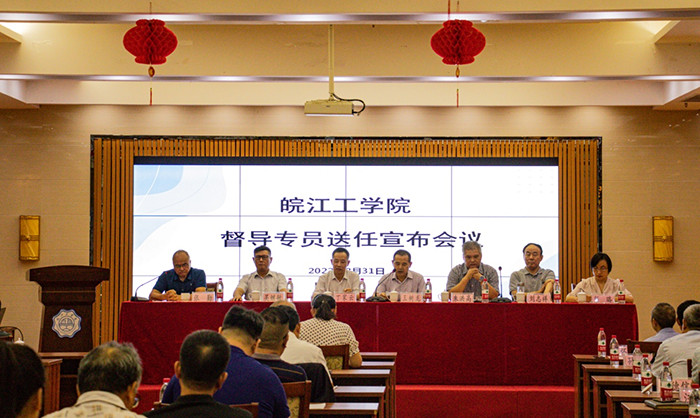 8月31日,安徽省委教育工委至皖江工学院举行新任督导专员送任宣布会。省委教育工委组织干部处副处长王树龙,省委教育工委组织干部处四级调研员彭璐专程到皖江工学院宣布丁家云同志的任职决定。皖江工学院董事长朱洪高,原任督导专员刘志祥,校长吴继敏,党委副书记张勤,副校长汪光阳、张建民、阮怀宁、朱建芬、侯进元,董事长助理孙良,各二级学院院长,各党总支书记,各职能部门主要负责人参会。会议由张勤主持。