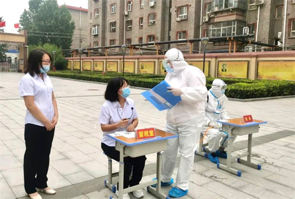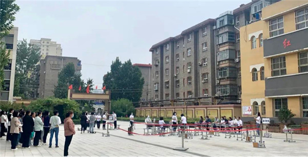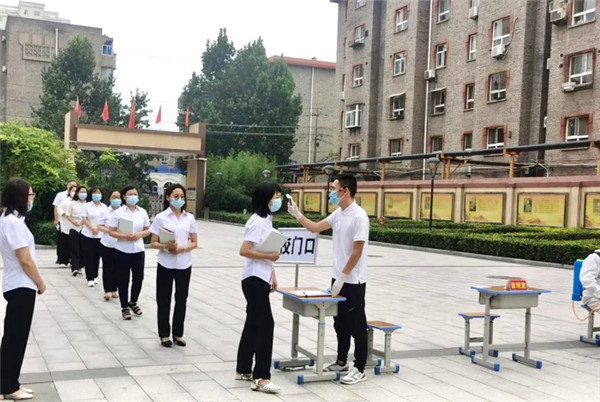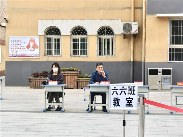 临汾市第三小学在校门前设置检测点,实行错峰入校制度,检测人员佩戴口罩、一次性医用手套进行安全检查和组织引导工作,要求每位学生戴口罩,前后间隔1米,有序排队依次进行体温检测,合格者方可入校。