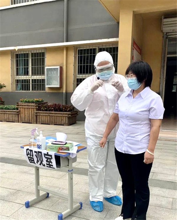 在上课过程中,有“学生”突感不适,任课教师在测温后发现体温高于37.3℃,立即通知班主任和保健老师,班主任将发热学生带到隔离观察室,保健老师对其进行初步诊断,第一时间通知监护人,并上报临汾市第三小学疫情防控指挥小组。任课教师将其余学生带离教室,转至备用教室。临汾市第三小学立即启动应急预案,校园消杀组对发热学生所在教室进行全方位消毒。
