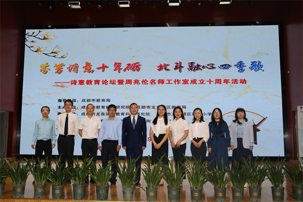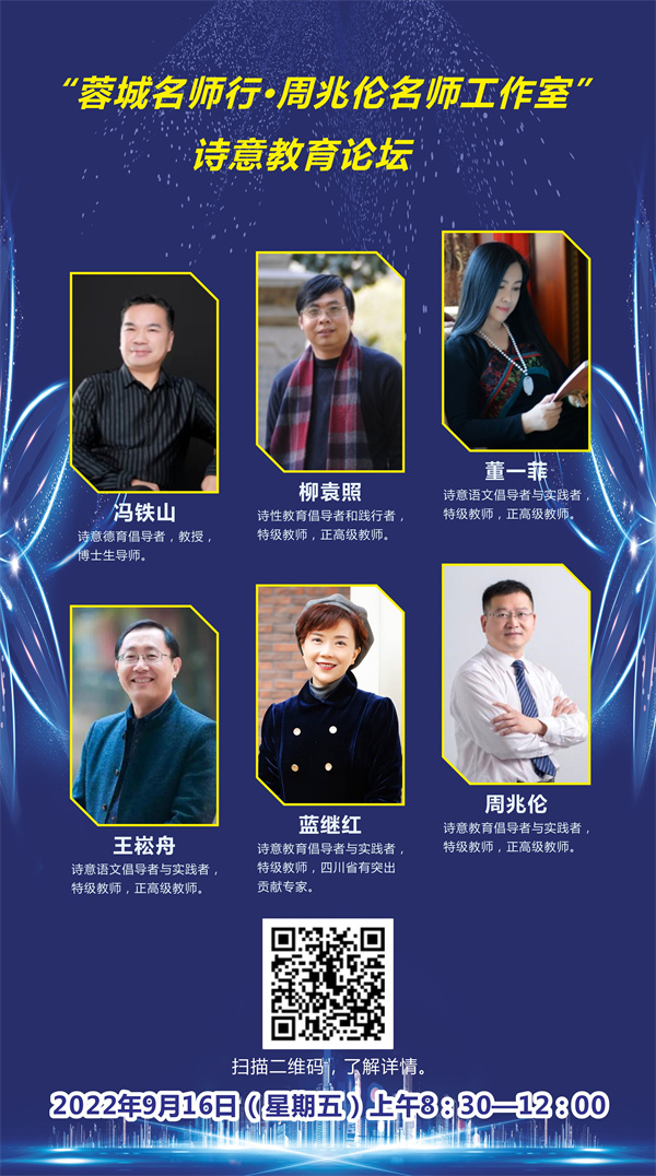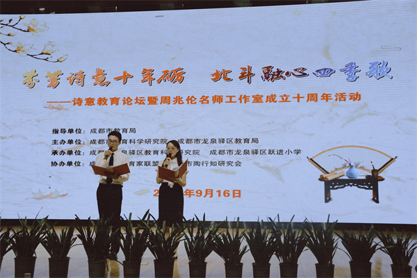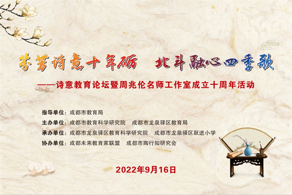2022年9月16日上午,作为“蓉城名师行”九月第一站,由周兆伦名师工作室发起的“全国诗意教育论坛”在四川省成都市龙泉驿区跃进小学如期举行。此次活动由成都市教育局指导,成都市教育科学研究院、成都市龙泉驿区教育局主办,成都未来教育家联盟、成都市陶行知研究会协办。与会的嘉宾有成都市教育科学研究院罗清红院长,成都市陶行知研究会姚文忠会长,“诗意德育”倡导者、宁波大学冯铁山教授,“诗性教育”倡导者、特级校长柳袁照老师,“诗意语文”倡导者、教育部基础教育一线课程专家董一菲老师,“诗意语文”倡导者、教育部国培计划专家库专家王崧舟老师,“诗意教育”倡导者、四川省特级教师蓝继红校长,四川师范大学博士生导师曹正善教授,龙泉驿区教育局张英武副局长,龙泉驿区教育科学研究院周文群院长,“诗意教育”倡导者、全国优秀教师周兆伦老师,全国优秀教师、四川省特级教师王富英老师,以及诗意教育共同体专家团队成员、成都市及龙泉驿区名师工作室的领衔人和研修员,成都市周兆伦名师工作室成员以及诗意教育基地校——四川省江油市诗城小学、成都市龙泉驿区跃进小学的教师代表等。活动期间,云端同步播放,全国各地中小学教师、教育工作者6000多人线上同步观摩了研讨活动。