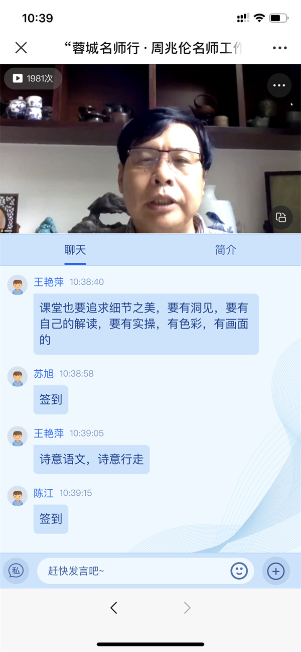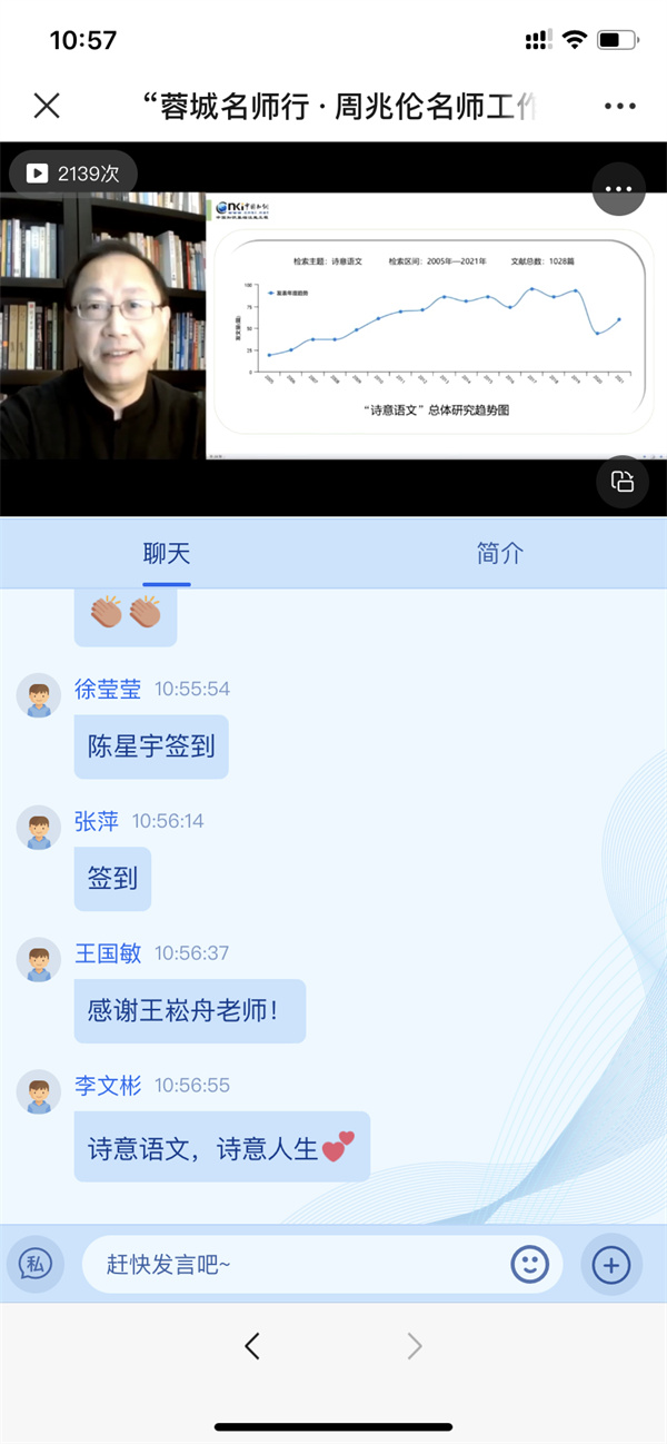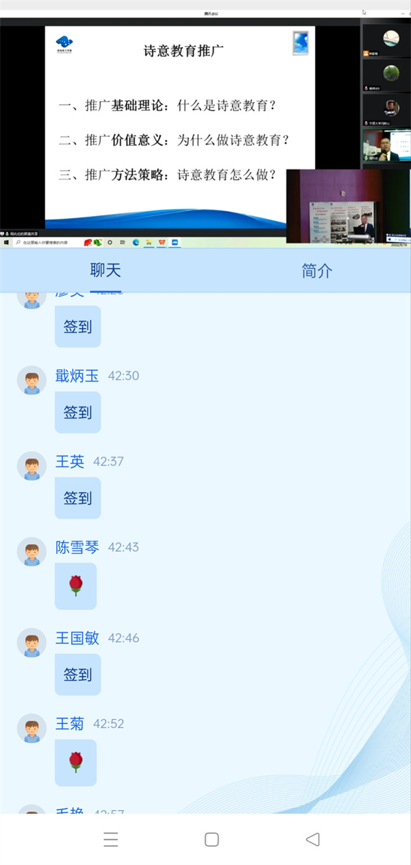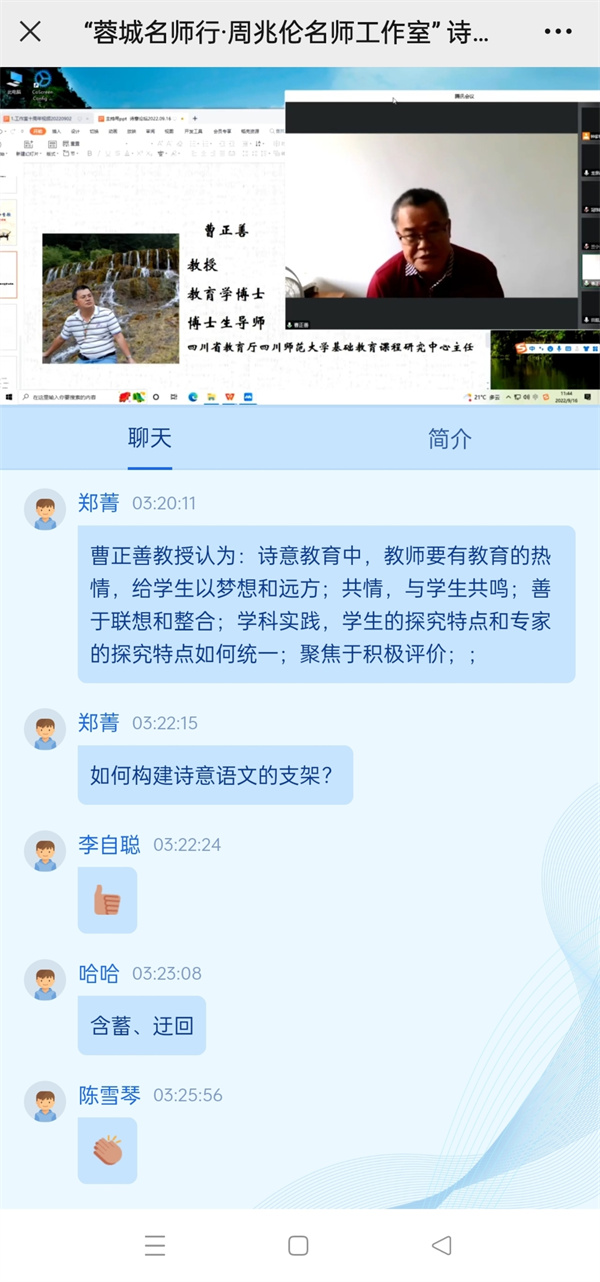 在与会人员与专家们的互动环节中,面对问题:新课改背景下,怎么开展诗意教育?曹正善教授说,要解决这个问题一是要找到诗意教育与新课程改革的对应点,二是弄清课程的结构化,三是积极进行学科实践,四是落实增值性评价,而最重要的是课程育人。他强调研究实施过程中要把诗意教育与新课标进行巧妙的结合和运用。他认为在诗意教育中,教师要有教育的热情,给学生以梦想和远方;要共情理解,与学生共鸣;善于联系和整合,比如大概念、大单元教学等;学科实践,要考虑学生的探究特点和专家的探究特点;会比喻,让课堂生动起来;要更多地聚焦于积极的评价。一位老师向董一菲老师提问:在教学当中如何践行诗意语文这一理念?董老师说,诗意语文是一个动态生成过程,又是一个非常非常复杂的生命体。她提到诗意语文课要重视“曲问”,要避免直接,要体现含蓄,体现我们这个民族的审美。要着力运用赋比兴的手法,尽量使用暗示、象征的方式来“曲问”。就像在中国诗歌中,不会直接说春天来了,而会说燕子出现了,说柳绿了,说桃花灼灼了。委婉的曲问才能抵达某种诗意的彼岸,抵达某种诗意的境界。比如教学“青青子衿,悠悠我心”追问“青”是什么颜色?然后荡开笔墨,寻找文学里的各种“青色”,达到言在此而意在彼岸的艺术效果。有老师向柳袁照校长请教:诗性教师应该具备哪些素养或特质?柳校长说,一个诗性的老师应该是有生命质感(即灵与肉相结合)的老师。诗性的教师要有诗意情怀,要有一种担当精神,要有原创性。一位诗意教育研修员向王富英老师请教:对于诗意教育未来的发展有何建议?王老师说,诗意教育要抓住教育的本质(传承文化,立德树人)和关键要素(教师、学生、终极目标和方法构建研究模型);要揭示教育本质,明确价值取向,回归自然;要规范项目指标结构,加强量化分析,做到真正激励和唤醒;要强化途径艺术研究,彰显教师诗意,追求教育的真善美;最后要进行哲学层面思考,提高成果层次,真正弄清交往、对话和理解的内涵、关系、哲学依据、类型、策略方法等内容。