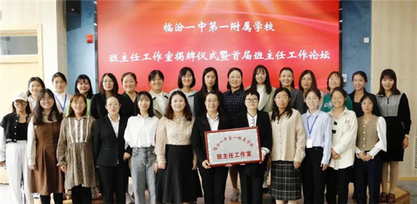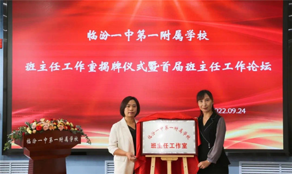 仪式伊始,在激动人心的音乐声中,宋鸿雁老师和魏鹏娟老师缓缓揭开“班主任工作室”红色的帷幔,那一瞬间,宛若画卷般的美好未来也随之展开,泛着银光的牌匾赫然入目,标志着临汾一中第一附属学校在班主任队伍建设方面迈出了重要的一步。