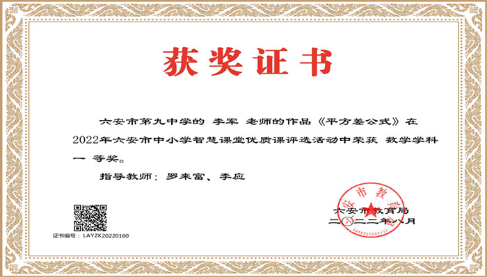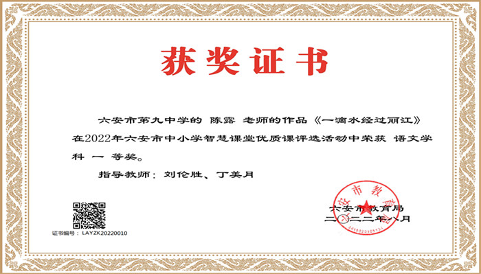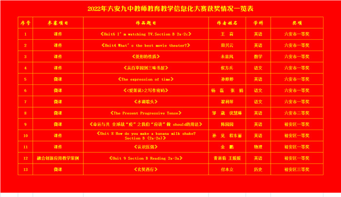 秋风送爽润皋城,捷报频传多振奋。近日,2022年安徽省六安市中小学智慧课堂优质课评选和信息化大赛结果揭晓,六安九中再创佳绩。在这两项比赛中,六安九中参赛教师全部获奖,其中,陈露、李军、黄道菊等三位老师喜获智慧课堂优质课市级一等奖,王莉、田兴云、未显凤、侯方兵、孙婷婷、杨磊、张娟、翟利萍八位老师获得信息化大赛市级一等奖。这两项比赛,延续了六安九中在此项比赛中的辉煌。