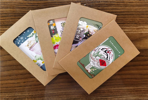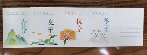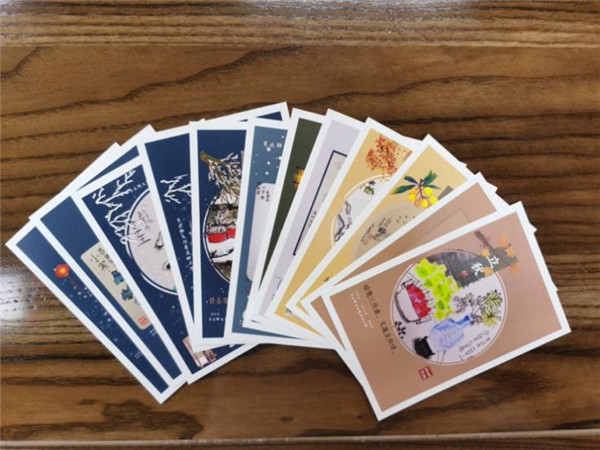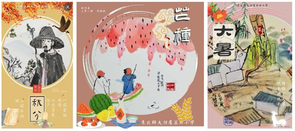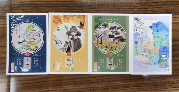 画完一张画并没有真正完成创作,还有非常重要的一环就是评价。优秀的节气作品被制作成学校周边文创,比如明信片、日历、海报等。这些文创会作为学校礼品送给客人,或奖励给学生。宣传节气文化的同时,也鼓励了学生创作的信心。这种面向全校,面向社会的评价更客观,也更能激发学生再次创作的愿望。这样的“创作”才更完整。