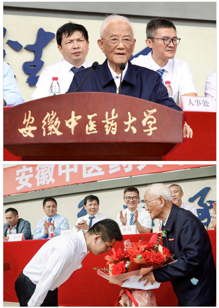 教师代表、国医大师徐经世以《矢志中医理术兼修》为题谆谆教诲后学,作为一名从事中医临床七十年的中医人,他结合自身的学医行医历程,与同学们分享学习所得,一要树立中医信念,坚定文化自信,回答“中医自信从哪来”;二要运用辩证思维,打牢中医功底,回答“学中医学什么”;三要认真研读经典,丰富临床实践,回答“学中医怎样学”。他以唐代文学家韩愈《劝学诗》所言“读书患不多,思义患不明,患足己不学,既学患不行”之句与同学们共勉,寄望大家能忠诚于中医事业,学好中医,做铁杆中医!