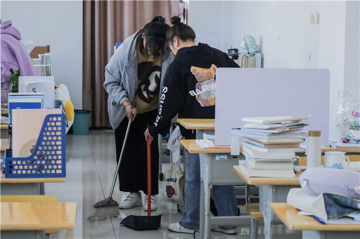 擦拭门窗、清扫地板、整理书籍、安全提醒……在分送饮品的同时,数十名学生手持劳动工具为考研学子清扫教室,排查安全隐患,他们当中有学生党员、学生会成员、大一新生团员。来自化学专业学生第一党支部的黄蓉担任了此次活动的“小队长”,在进入考研自习室时,埋头学习的考研学生也深深地触动了她。“学长学姐们整天泡在自习室里,为自己的理想拼搏奋斗,在为他们做好后勤工作的同时,我也会学习他们坚持不懈的精神。”