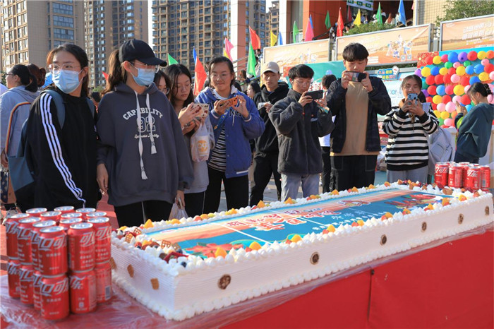 走进活动现场,映入眼帘的是一个约2m长的加厚大蛋糕,蛋糕的正面呈现出一幅美食图,周围点缀着各种水果。在现场观众的簇拥与欢呼声中,学生们怀揣着对未来的美好祝福,一同切开寓意美好的蛋糕。