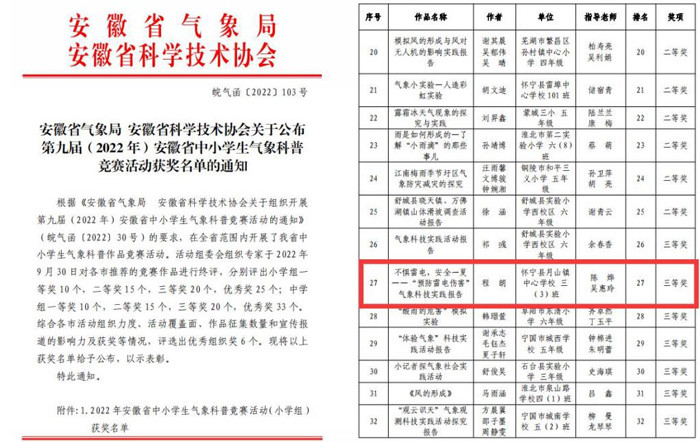 近日,第九届安徽省中小学生气象科普竞赛活动结果揭晓,月山镇中心学校程朗同学荣获小学组三等奖(全省排名第27)。这是该校坚持落实“双减”政策,积极创建科普特色学校结出的又一硕果。