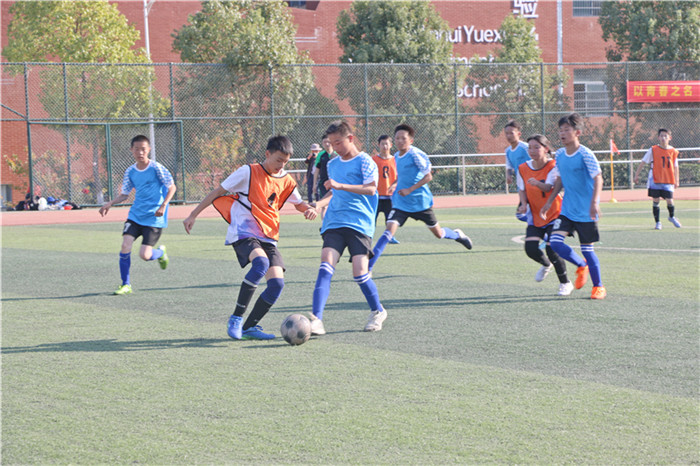 绿茵场上,足球在各队队员的脚下自由滚动跳跃,他们流畅的配合、熟练的带球、奋力的拼抢,踢出青春活力。