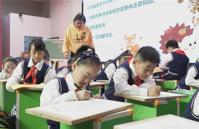 音美艺术组的老师们基于对2022版《艺术课程标准》的深入研读与讨论,将本次主题教学融合了音乐、美术、语文、信息技术等多门学科,由濉溪路小学音乐教师董婷婷、美术教师刘相乡分别执教完成两节现场课教学内容。通过感知四季交替,引申出“秋声秋色”的课程主题,让学生体会如何用眼睛观察世界,用耳朵聆听世界,用心灵去感悟世界,在提高学生审美感知能力的基础上,让学生学会一定的艺术技能与技巧,感悟不同艺术门类的表现方式和特点,培养他们的艺术表达能力。