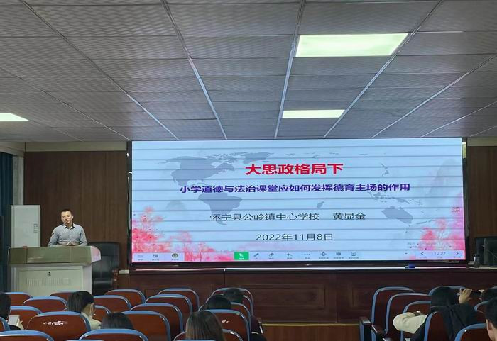 下午的活动主要是专题讲座。第一场是由怀宁县公岭中心学校的黄显金副校长带来的名为《大思政格局下小学道法课堂应如何发挥德育主场的作用》的微讲座。他以其专业的素养紧扣新课标,并结合实际教学聚焦小课堂,放眼全社会,给在场所有老师带来了一道丰盛的道法“大餐”。