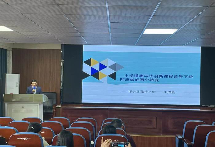 第二场是由安庆市学科带头人、独秀小学副校长李成胜带来的《小学道德与法治新课程背景下教师应做好四个转变》专题讲座。李成胜认为,道德与法治教师应实时更新自己的教学理念,尤其是年轻骨干教师应把目光放长远,要立足素质教育,具有改革创新精神。新背景、新时代,广大教师应做到四个转变,即教学观念的转变、教师角色的转变、课堂教学方式的转变、教学评价的转变。李成胜的讲座既高瞻远瞩又脚踏实地,让现场教师在收获满满的同时又深受启发。