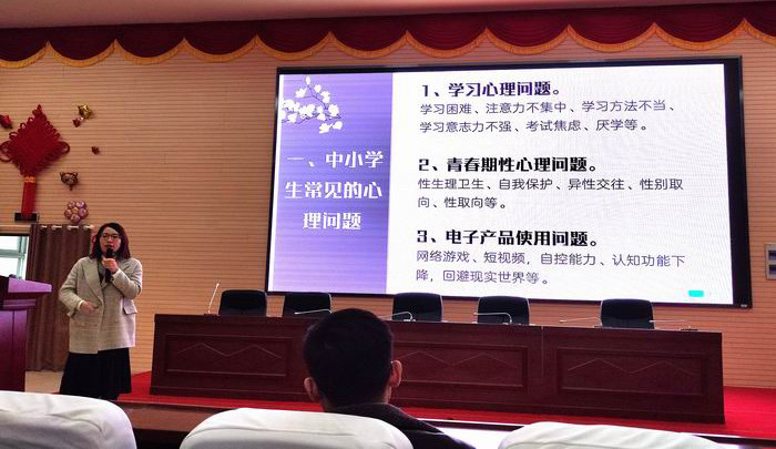 在信息技术飞速发展的时代背景下,中小学生的心理发展是怎样的?目前青少年有哪些常见心理问题?作为教师,我们又该如何识别和干预?带着这些问题和思考,11月18日下午,合肥经开自贸区实验学校特别邀请了合肥市一六八玫瑰园学校的心理老师聂丹,开展了以“中小学生心理问题的识别与初步干预”为主题的讲座。经开自贸区学校所有班主任在中学部报告厅,集中聆听了讲座。这次讲座从学生常见心理问题,心理问题的识别、心理问题的的初步干预,以及家校合作四个方面展开,思路清晰,内容详实,为我们提供了系统的心理问题识别与干预方法。