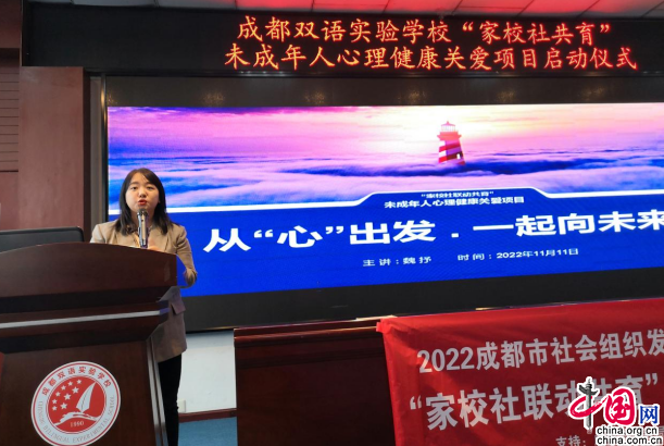 中国网11月22日讯(王李科)心理健康教育对于中小学生而言,是助力其阳光快乐成长的基石。11月22日,记者从成都双语实验学校了解到,该校于日前启动了“家校社联动共育”未成年人心理健康关爱项目。据悉,该项目由成都市民政局、成都市慈善总会、抒抒心理咨询、成华区建华社区儿童之家、成华区向日葵青少年成长服务中心支持,成都双语实验学校承办。该项目采用“家-校-社”三方联动模式,借力家长课堂、教师工作坊、学生课堂和社区评价机制,通过SEL社会情感课程和团体心理辅导对该校学生、教师、家长开展心理健康教育,以此,促进师生、家长的心理健康水平,提升心理健康教育能力。