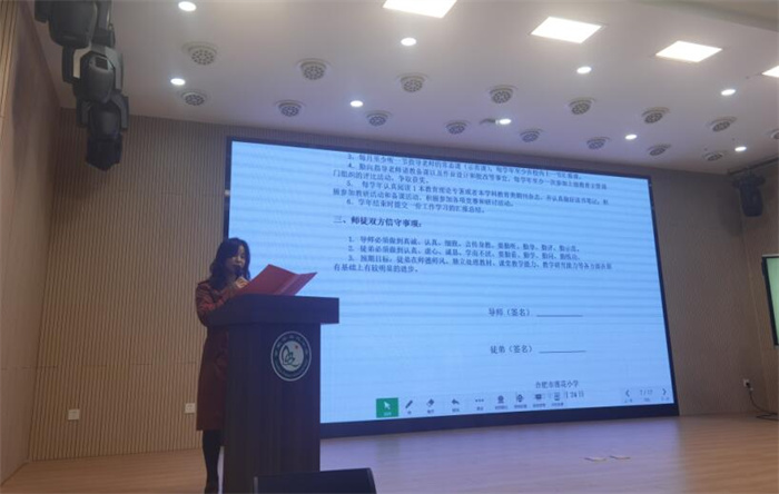 本次拜师会在校领导的大力支持下,由教研副主任徐菁主持。方程主任宣布了师徒结对协议内容。