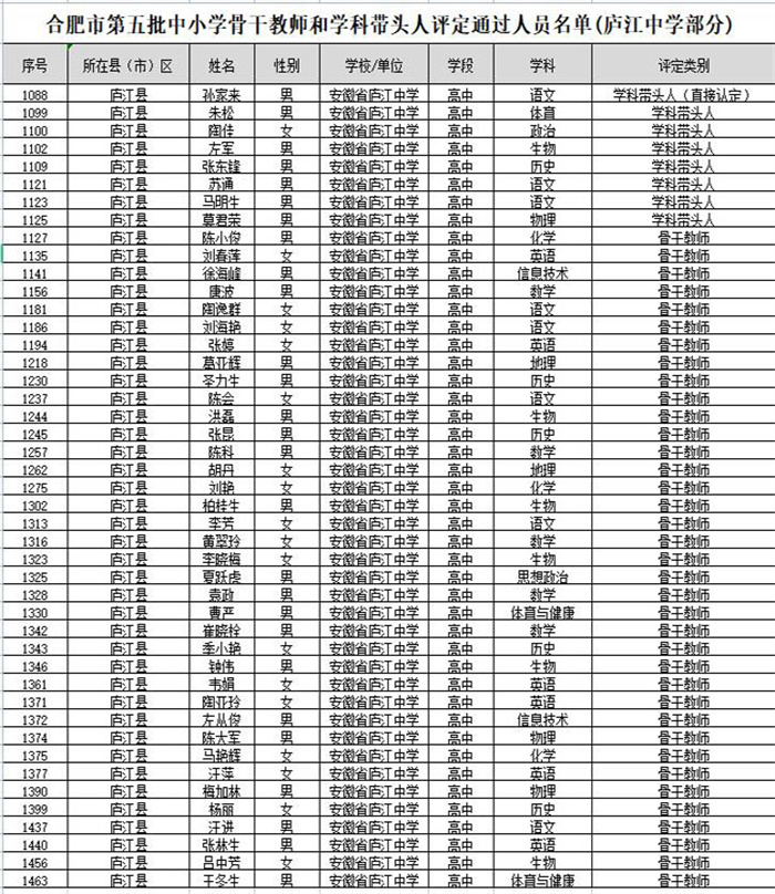 硕果累累承荣誉,砥砺奋进创佳绩。依据《关于开展合肥市第五批中小学骨干教师和学科带头人推荐评定工作的通知》要求,经合肥市教育局的初选、推荐及专家评选,最终,庐江中学孙家来等8位教师被评为合肥市第五批中小学学科带头人,陈小俊等37位教师被评为合肥市第五批中小学骨干教师,获评人数位居合肥市同类学校前列。