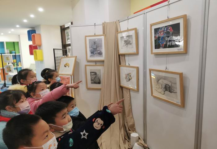当天上午,小观众、小书画家们三三两两地簇拥在一起,欣赏着他们喜欢的作品。