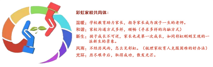 加强家校协同育人的彩虹课程体系建设,以人的核心素养发展、人生规划、科学素养、审美素养、健康素养和社会实践能力等几个方面入手,形成相互衔接、相互补充、相互促进的教育课程体系。家校联动的最大“加油站”,莫过于开设多样的家长课程。学校结合学生实际每学年度设定若干家校课程链。彩虹家校课程的内涵为家校共育打下了良好的基础。