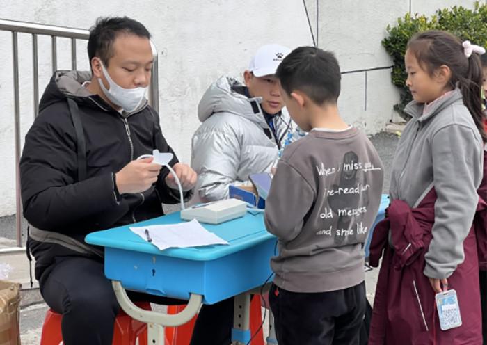 充分热身后,一个个同学有序地拿好测试仪吹嘴,做1-2次深呼吸,头部略向后仰,慢慢地弯腰尽全力吐出来,直至不能呼气为止。同学们一吸一呼,尽力拿到好成绩,真棒!