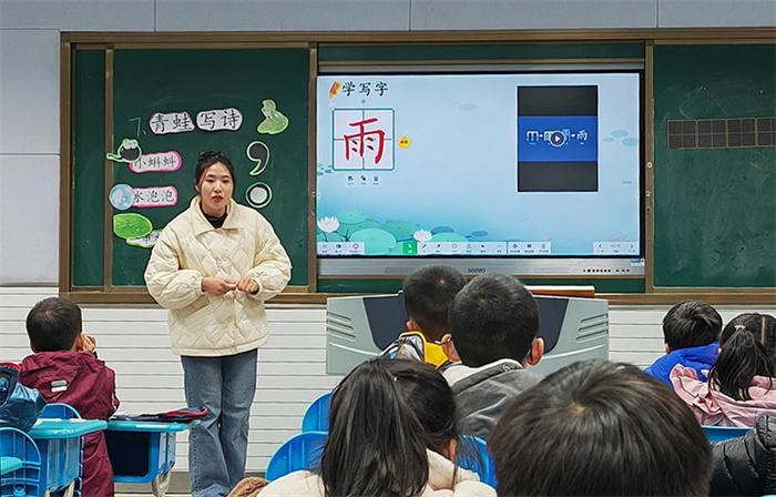 张孟雪老师为大家展示的是一年级课文《青蛙写诗》。张老师用充满童趣的语言、具有亲和力的姿态带领学生进入课堂,充分激发孩子们的学习兴趣。整节课气氛活跃,课堂评价语丰富。张老师从一年级学情出发,利用小口号提醒学生端正坐姿、认真听讲,朗读形式多样,让学生在朗读中体会儿歌的美妙。