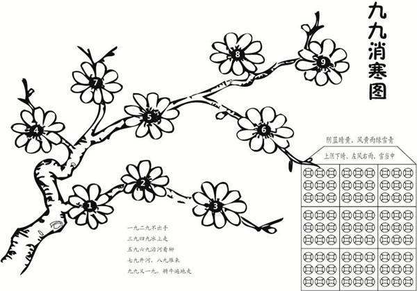 从冬至日起便要开始“数九”了,每9天为一个“九”,数到“九九”八十一天,便“九尽桃花开”,春深日暖。为了打发这漫长的冬日,古人喜欢在纸上画一株素梅,再画出八十一个花瓣,每天用彩笔染上一瓣,等八十一瓣填满,“九九”便过去,春也就来了。