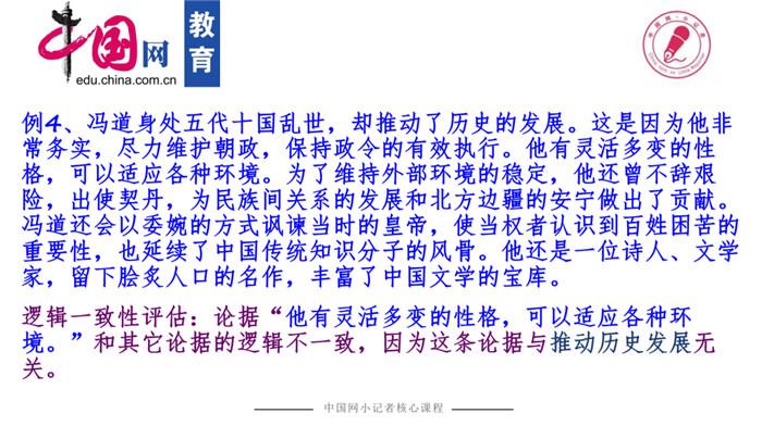 我认为论据②逻辑不一致。在五代十国的乱世中,拥有灵活多变的性格,可以适应各种环境的人有很多,但他们并不能推动历史发展,所以这句话作为论据并不足以支持论点。