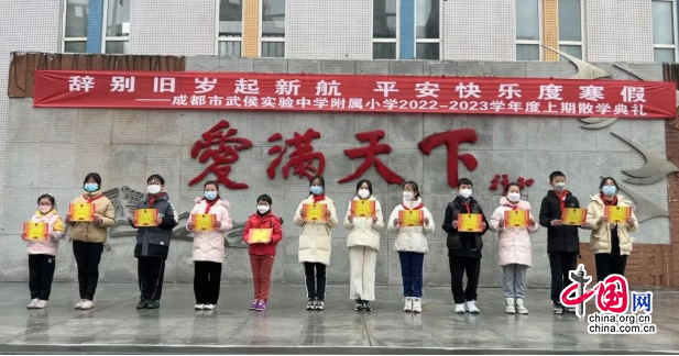 中国网1月3日讯(宋得恩)一路欢歌,送走了充实、愉快的校园时光;一心坚守,迎来了2023年的寒假生活。2022年12月30日,成都市武侯实验中学附属小学全体师生参加了“辞别旧岁起新航,平安快乐度寒假”主题散学典礼。