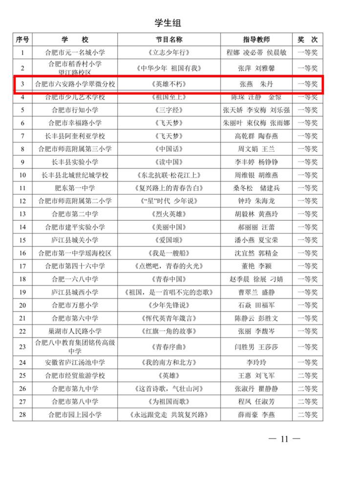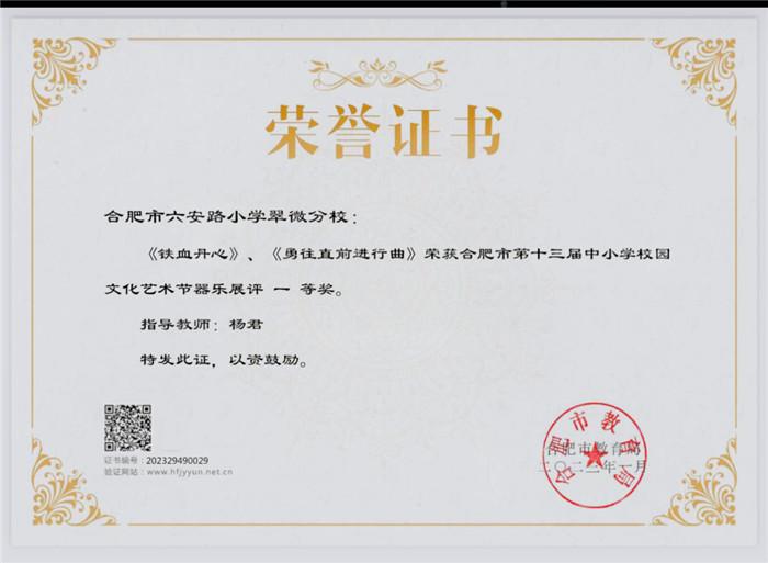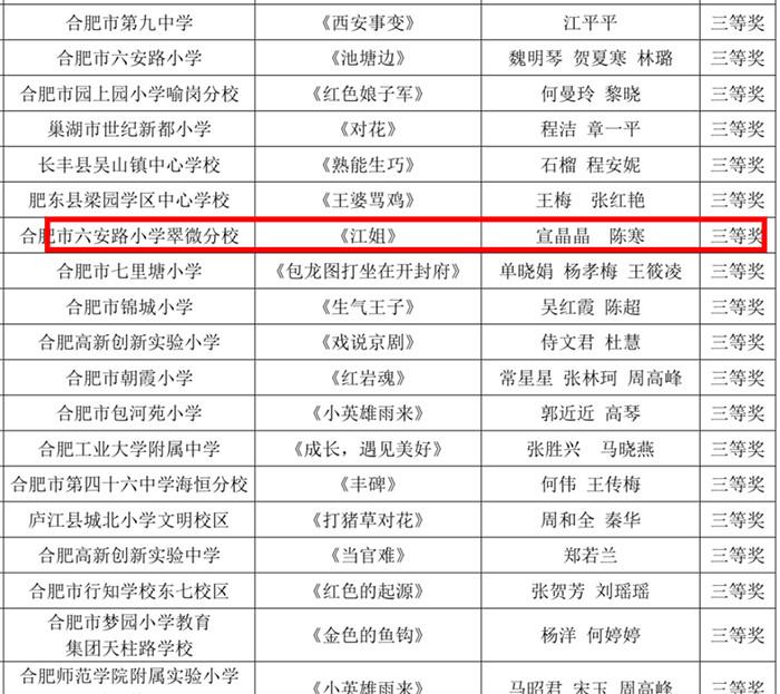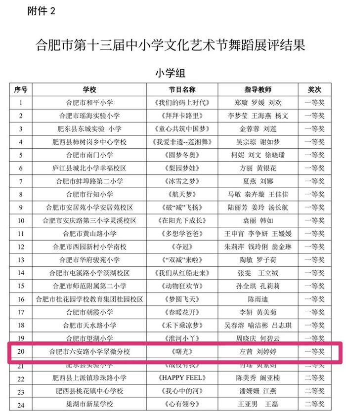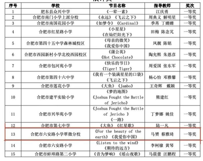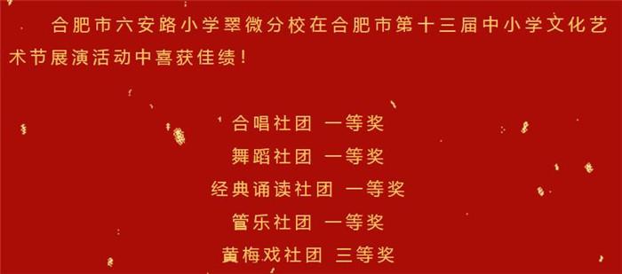 为落实立德树人育人目标,促进学生全面发展,根据《关于印发 2022 年合肥市中小学、幼儿园素质教育系列活动方案》(合教秘〔2022〕18 号)安排,合肥市教育局组织开展了合肥市第十三届中小学文化艺术节器乐展评展演、戏剧展评、合肥市第九届“广玉兰杯”中小学生经典诵读展评等系列活动。合肥市六安路小学翠微分校合唱社团、舞蹈社团、管乐社团、黄梅戏社团、经典诵读社团等学生团体积极参加,突破自我,喜获佳绩。