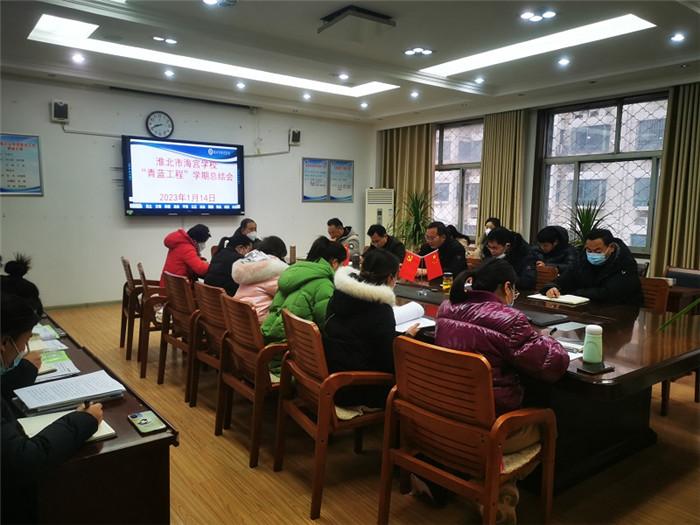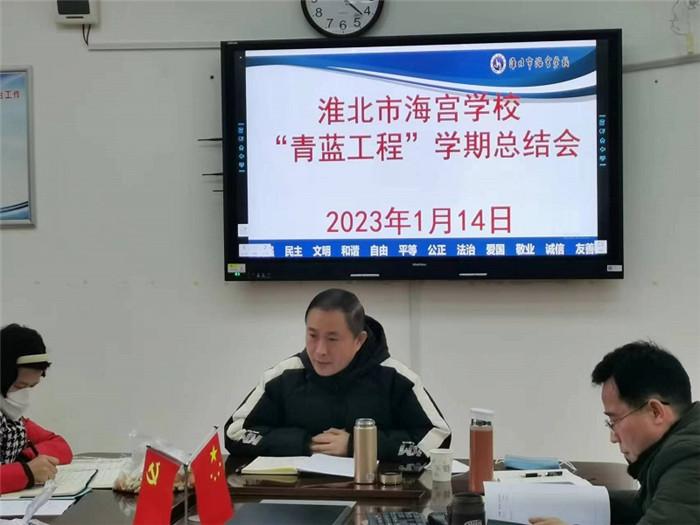 2023年1月14日上午,海宫学校“青蓝工程”学期总结会在综合楼四楼会议室召开,该校党总支书记、校长刘恩平和副校长王磊、朱孝喜、朱功转及结对子青年教师出席活动,会议由该校教科室主任张鹏主持。