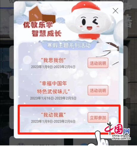 中国网1月19日讯(王馨)假期是学生学习、身心的调整期,也是亲子互动的亲密期。2023年超长寒假已至,怎样安排才能让孩子们度过一个快乐有意义的假期?近日,成都市武侯区教育局依托“武侯智汇云”,精心为孩子们准备了“快乐寒假”线上活动。