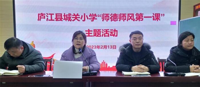 教师是立校之本,师德是教育之魂。为深入学习贯彻党的二十大精神,进一步加强和改进新时代师德师风建设,引导全体教师争做“四有好老师”,以良好的精神面貌迎接新学期工作,2023年2月13日下午,庐江县城关小学开展了2023年春季“师德师风第一课”主题活动。活动由城关小学校长周纪红主持,全体教师参加。