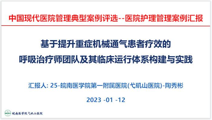 此次评选活动共17个主题,历时近4个月,全国近百位评审专家层层把关。由皖南医学院第一附属医院护理部主任陶秀彬主持创新开展、呼吸治疗师团队主导的重症机械通气患者管理模式运行以来,在改善临床质量指标、降低气道并发症、提高临床疗效方面取得了令人举目的成效,学术与专业影响力不断扩大。案例线上汇报后,得到同行的极大关注,电话询问、要求选送学员参加医院的呼吸治疗师培训班学习。最终,通过案例初评、复评、终评PPT汇报答辩等环节,医院申报的《基于提升重症机械通气患者疗效的呼吸治疗团队建设与临床实践》案例在医院护理管理主题中获全国“典型案例”佳绩。