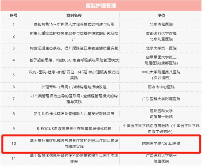 2月17日,国家卫生健康委能力建设和继续教育中心发布了2022年度中国现代医院管理典型案例评选结果,皖南医学院第一附属医院护理部申报的项目《基于提升重症机械通气患者疗效的呼吸治疗团队建设与临床实践》,从全国190家医院609个案例中脱颖而出,被评为2022年度中国现代医院管理典型案例。