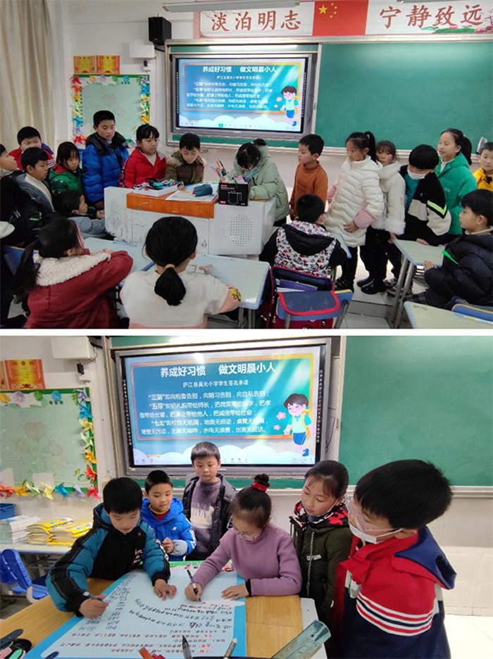 在班主任们的精心组织下,各班召开了以“养成好习惯 做文明晨小人”为主题的班会课。班会课上,班主任老师们通过讲解文明礼仪行为的重要性,组织学生对校园里的课间喧哗追逐、乱扔纸屑、乱涂乱画等不文明行为进行讨论,让学生们了解“文明礼仪”的内涵。同时,各班主任还引导同学们签署了承诺书。在班会课后,各班将学生的文明承诺书张贴在班级,以此提醒学生随时规范自己的行为习惯。