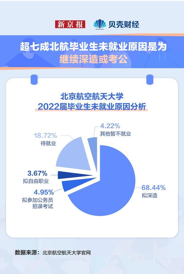 北京航空航天大学对2022届未就业毕业生进行了不就业原因调研发现,68.44%的北航毕业生不就业的原因是继续深造,还有4.95%的毕业生为参加公务员招录考试而不选择直接就业。