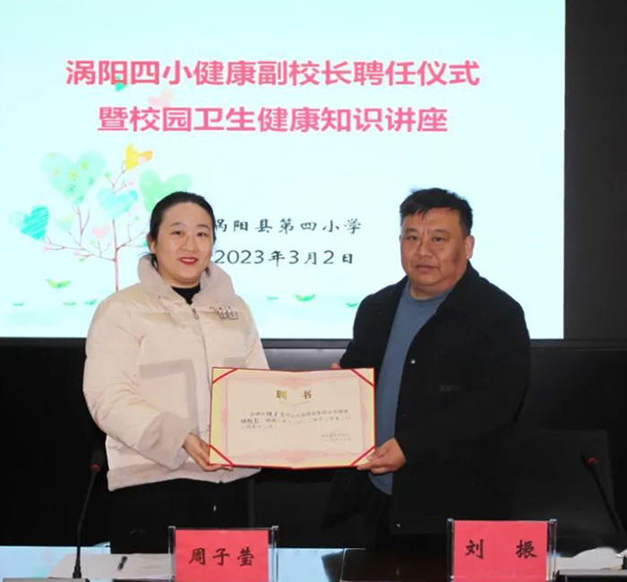讲座前,涡阳四小总支书记、校长刘振向涡阳县人民医院周子莹医生颁发涡阳县第四小学“健康副校长”聘书,并对周医生的加入表示热烈的欢迎!希望学校携手健康副校长以更专业的视角开展学校卫生保健工作,促进学生健康成长。