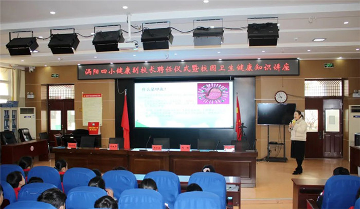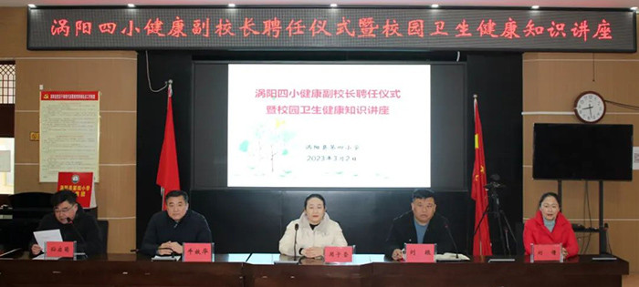 为进一步加强学校卫生与健康教育工作,切实提升学校公共卫生应急处置水平,全面维护师生生命安全和身体健康,3月2日上午,涡阳县第四小学举行健康副校长聘任仪式暨校园卫生健康知识讲座。特聘涡阳县人民医院护理部干事周子莹医生为涡阳县第四小学健康副校长。