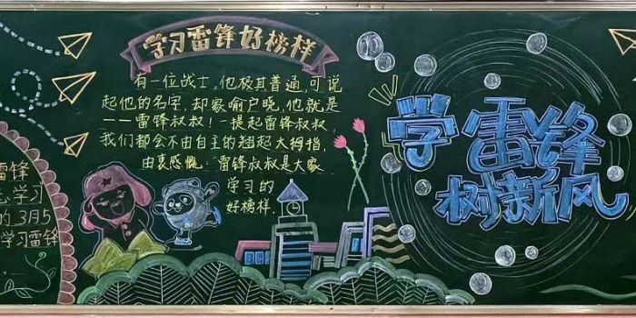同时,为了展示学生对雷锋精神的认识和理解,在班级形成浓厚的宣传氛围,在向雷锋学习活动月,学校各个班级巧妙构思,独辟蹊径,制作了图文并茂、各具特色的黑板报,对雷锋同志的介绍,对“雷锋精神”的解读,对雷锋日记的展示,充分展现了学生的思想认识和艺术个性。一位驻足于板报前的同学说:“我觉得雷锋叔叔非常伟大,我一定要学习他,团结同学,乐于助人。”