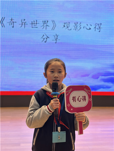三、四年级同学观看电影《奇异世界》。同学们在一次次意想不到的剧情转折与多元丰富的色彩碰撞中学习主角的冒险精神,知道了“我们身处的世界是一个生命体”,要以开阔的心胸去探索,尝试发现那些跟我们过往认知与价值观不同的新事物,学会接受挫折,尝试在不符合自身期待的处境中寻找解决之道。