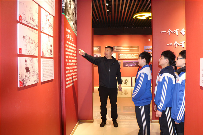 滕州市鲍沟中学团委书记李云鹏带领学生参观学校雷锋展室