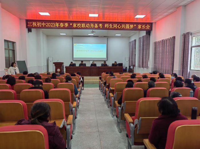为了让每一位家长进一步了解学校的办学理念和备考策略,搭建家校学习交流、研讨、共同提高的平台,形成教育合力,让初三学生以更好的状态备战中考,3月19日下午,怀宁县三祝初中在多媒体功能室召开九年级家长会。学校支部书记、校长丁建带领行政人员及全体毕业班教师出席会议,并作了主题发言,会议由丁永祥副校长主持。